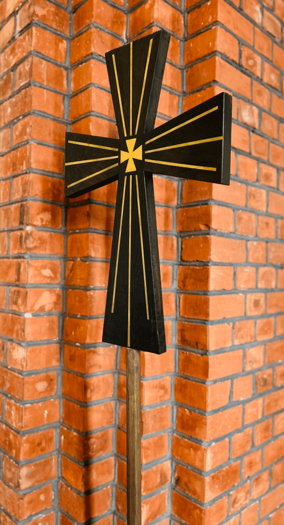 I visited the parish in 2023 and was shown around by the sexton. He showed us the processional cross, a recent creation, and told of its story. His neighbor was plowing his field and came across a massive stump under the soil. The stump was apparently about 2,000 years old. The sexton asked if he could use the stump in woodwork, and was allowed to. He carved the wood into the processional cross, and the wood had naturally gone black during its years underground. So this cross is not even painted or stained, just naturally black.